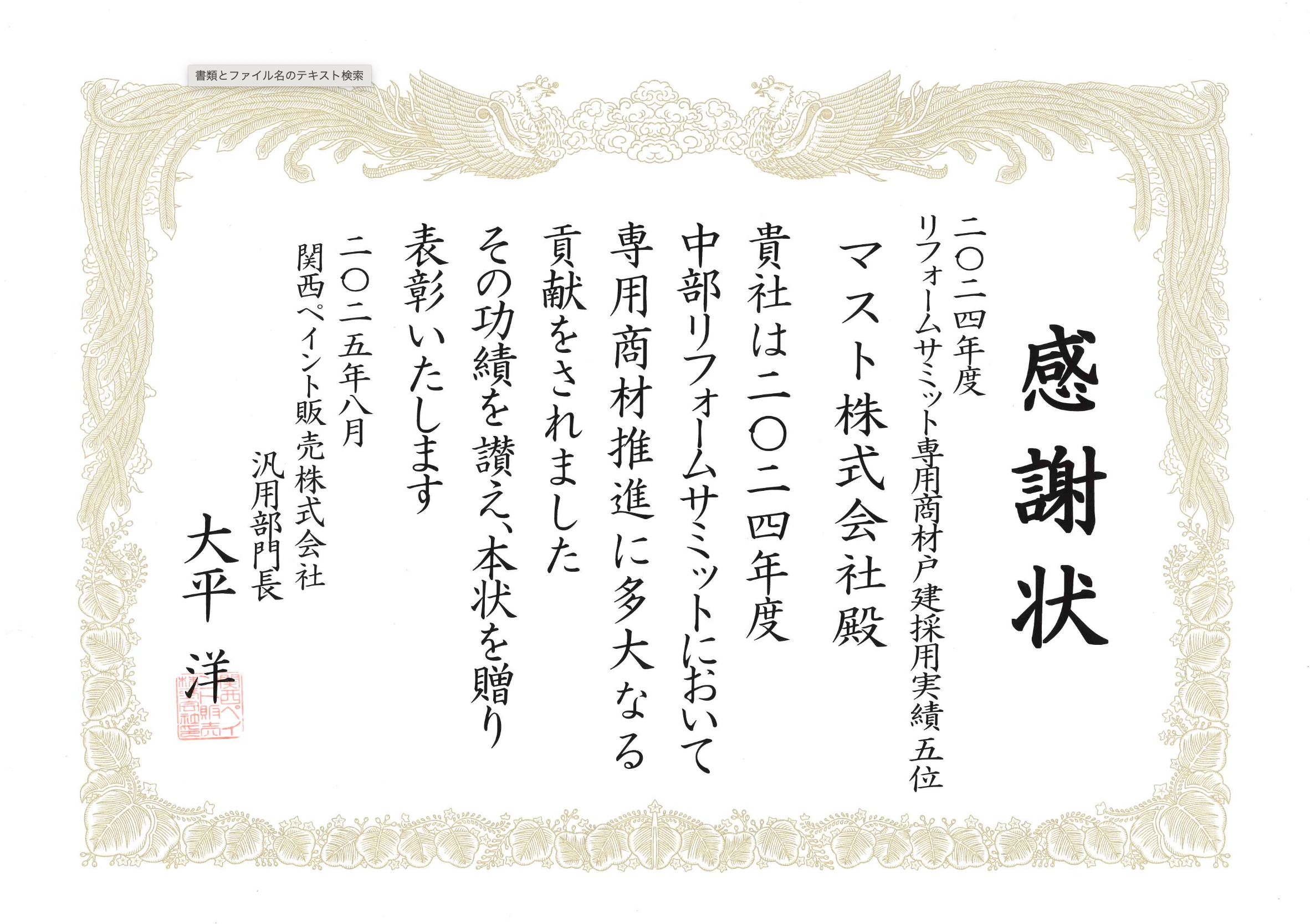 このたび、当社は中部エリアにおいて、100社以上の企業の中から選出され、関西ペイント株式会社様より表彰を受けましたのでご報告申し上げます。